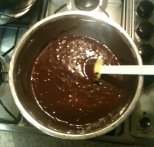 Your butter should be almost or completely melted now. Break the chocolate into smallish chunks (or the squares they come in) and add these slowly to the butter until all 120g are added. Now keep mixing the chocolate in the melted butter with a small whisk or a fork until everything is melted and blended together.