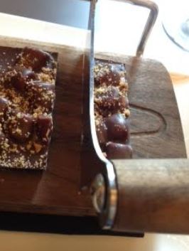 A combination of Valrhona chocolate, marshmallows, and graham. Created in a large, solid bar of Valrhona chocolate studded with marshmallows and sprinkles with graham on a guillotine so you can cut whatever size piece you wish.