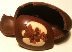 This is a small, perfectly formed milk chocolate egg. As you eat the milk chocolate, the crunchy bits are salt I think but also possibly something sweet. This is just a ton of fun. It is too sweet for me but I’m absolutely sure that on Easter morning when someone sees this cute little egg I believe that they will do what I did – break into it and eat it with gleeful abandon!