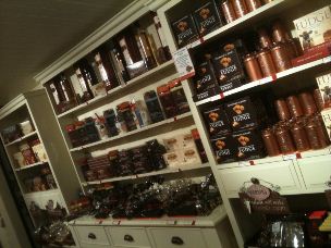 They work in a small area in the back of the shop but it has a widow which makes the workshop open for all to see so you can watch the tempering going on, the moulds being filled with chocolates, the shells being filled and more., They have a bit of Willie’s 100% in the window and some chocolate fish as working on view is much like being in an aquarium I expect – you’re going about your business and people keep stopping, pointing and staring 😀