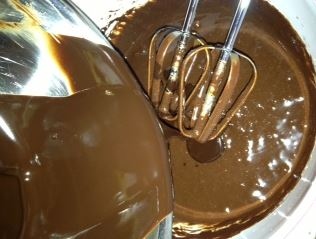 • Gently mix the cooler chocolate mixture into the egg yolks and sugar mixture. If your chocolate is not cool, it will cook the eggs and the mixture will be unusable.