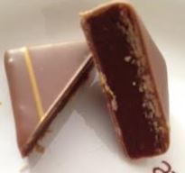 Faubourg – This ganache enrobed in milk chocolate unveils a heart of passion fruit with vanilla notes, enhanced by the soft tones of mango juice, mellowed by lemon tree honey. This has the flavour of the mango and passion fruit without the acidity, the honey and vanilla combining together to mellow everything. A gorgeously flavourful chocolate without booziness.