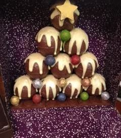 The Christmas tree made of baubles is a lot of chocolate! Seated on a chocolate slab base, the balls may be hollow but thre are a lot of them plus they are held together with chocolate and topped with white chocolate!