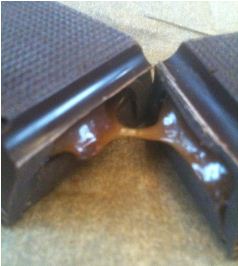 You can see how large the chunks are – three “squares” on a 45g bar means 15g a ‘bite’ 🙂 I feel like, as this is a filled bar, that this makes the chunks you are able to separate too big to eat easily but I wonder if more indentations would have compromised the structre and transportability of the bar. The last thing anyone wants is a handbag or pocket full of caramel! Thank goodness for the thick chocolate then! In this bar after trying to eat a square I feel like the delicious chocolate was a bit too thick – I found myself biting a bit of the base of one square before biting my way around the walls. I know that for many chocolate lovers, this is going to be a kind of heaven and that is likely why the milk version won AoC silver. The chocolate is quality so I don’t mind but the vanilla really hits you and makes you notice it when the chocolate combines with the caramel.
