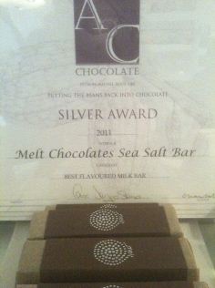 This bar is wrapped in the fun brown paper I have come to associate with Melt. I love walking into a Melt shop and seeing all the bars and Mud Pies and Brownies laid out. To smell the chocolate and see the awards. Melt seems to an outsider with all their Academy of Chocolate awards to be one of the most AoC awarded chocolatiers around but I don’t know if that is accurate.