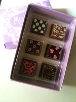 I have to say that MoRoCo gets packaging for a gift right. A beautiful lavender bag with almost lime green tissue makes the expensive chocolates in their extreme box a delightful package. It’s a gift for yourself or someone else. The large box holding only 6 chocolates is a bit of a disappointment when you open it as you expect more but I would hope the chocolates themselves make up for it.