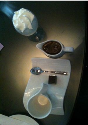 The hot chocolate is no subtle affair. As you can see, it comes with a number of elements: a cup, a chocolate, a pot of hot chocolate and a glass of whipped cream. I tried the hot chocolate straight first. It was thick, dull and lacklustre. Having recently tried other hot chocolates I can say this was dull and lifeless. Worse it left an oily coating on my lips. Yuck. I added whipped cream to it. I got some on my nose and looked like a clown. I mixed it in. Still no improvement.