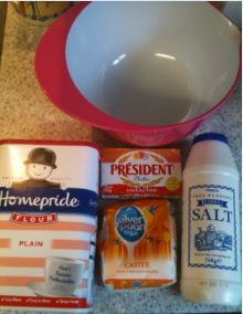Sift together the salt, flour and sugar. I put half the flour in the sieve, add the salt then add the rest of the flour then the sugar.