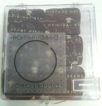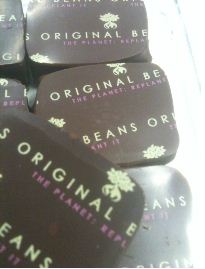 I bought myself a small box of the Original Beans chocolates that Geert Vercruysse created for Chocolate Week. The transfers proudly announced that for each bar a tree was planted. If everyone switched from Cadbury’s to Original Beans we’d be able to save the habitat of the Gorilla, rescue an almost extinct bean and increase the diversity of cocoa on the planet while increasing the base salaries of farm workers. Plus we’d all be eating AWESOME chocolate bars. This is about the ganaches however and so I digress…