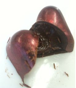 When my secret admirer is sending me chocolates, I’d like for him/her to include some of these long-stemmed dark chocolate roses please. I remember seeing them last year and thinking how there wasn’t a hope in heck I’d get a dozen of these for Valentine’s Day (and how I’d never be able to bring myself to eat them anyway). They are absolutely beautiful and it broke my heart to have to cut into it for the review. Tip – don’t bother cutting – break it open along the seam. This is a 68% Ghanaian dark chocolate and oh how I love it. I don’t taste the organic rose oil as distinctly as I did in the ganache here. The dark chocolate is bold and the rose oil is a hint in the background you get as you let it melt in your mouth. It hides in the flavour of the chocolate, peeking out in the taste as a delicate aftertaste that you catch a hint of after you finish a piece and have savoured it. It is the whispered memory of the rose that lingers on your palette as your savour the anticipation of the next bite.