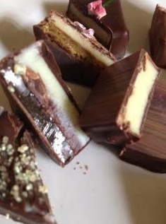 Rhubarb and Custard – from the moment you bite into this you’ll be taken back to childhood. Sophisticated creation and delightful on the palate, the custard flavour bursts through as you are tasting the star anise and rhubarb. What an amazingly punchy chocolate.