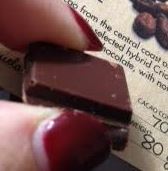 Grenada – good chocolaty smell – quite chocolaty. It is the essence of chocolate, like the quintessential chocolate smell. The taste is chocolate – a deep, dark chocolate. It is almost earthy but the flavour is fudgy chocolate. There is an edge of sweet as though it could go darker to maybe 75% or80% but this is an amazing dark chocolate to learn to love dark chocolate with. No challenging flavours, deep, dark rich chocolate flavour with a delightful finish – like eating a sweet brownie in chocolate bar form. On the finish there is almost a hint of red berries.