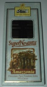 According to the packaging Super Novanta Amazzonia 90% cocoa minimum is a gourmet chocolate, with a noble character. It has been developed through a careful selection of valuable cacaos wisely blended to enhance the notable fruity flavour and the aromas of the best cacaos from Venezuela.