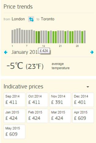Not only can I see which month will be the cheapest (looks like November – who wants to visit Toronto in the season of cold and possible slush? Yuck!), I can also within the month check out which the cheapest days are to travel: