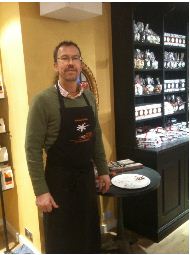 Had a lovely shop at Liberty on Saturday but a pretty poor one at Selfridges. I had staff ignore me, turn away from me, run away from me, be ignorant about things in their department and be downright rude. At least the Pierre Herme staff were lovely. The macarons weren’t (chocolate one was decent) but the staff were. Don’t buy the chocolates without check the review though! At Liberty I was lucky enough to run in to Damian Allsop who was showcasing his chocolates. I had a chance to see him in action and take a photo of him at work.